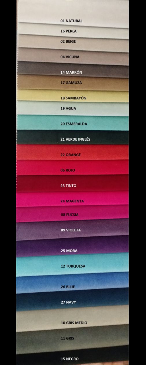 - Tapizada en tela Pana Donn (color a elección: Natural, Perla, Beige, Vicuna, Marron, Gamuza, Sambayon, Agua, Esmeralda, Verde ingles, Orange, Rojo, Tinto, Magenta, Fucsia, Violeta, Mora, Turquesa, Blue, Navy, Gris Medio, Gris, Negro)
